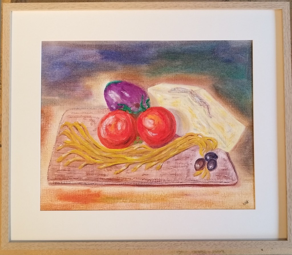 Ingredients for Pasta puttanesca, oil on paper. SOLD.