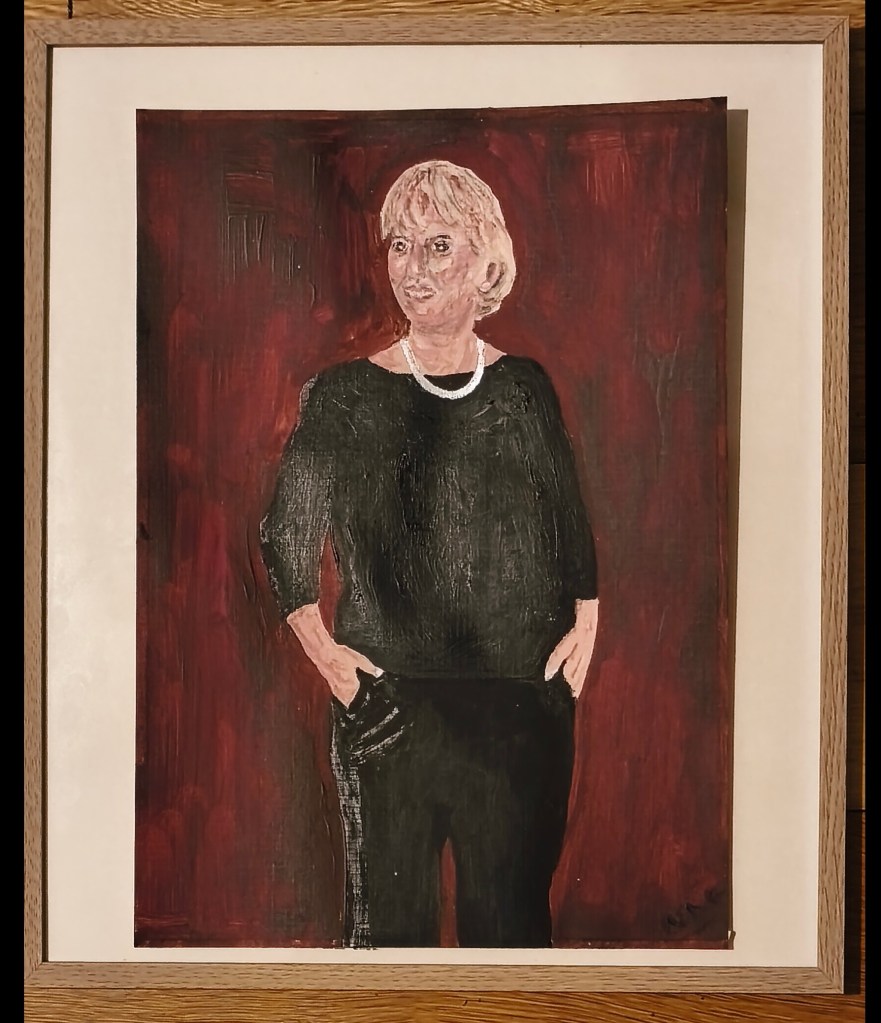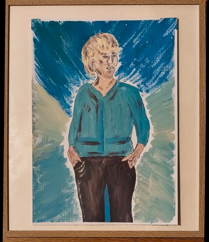 Self-portrait, blue period, acrylic on paper, A4 plus frame, £120, available at The Open Art Club Community Portrait Exhibition, Blackhorse Workshop Cafe, Feb 3rd to March 9th 2026. Open event February 11th 1-3pm.